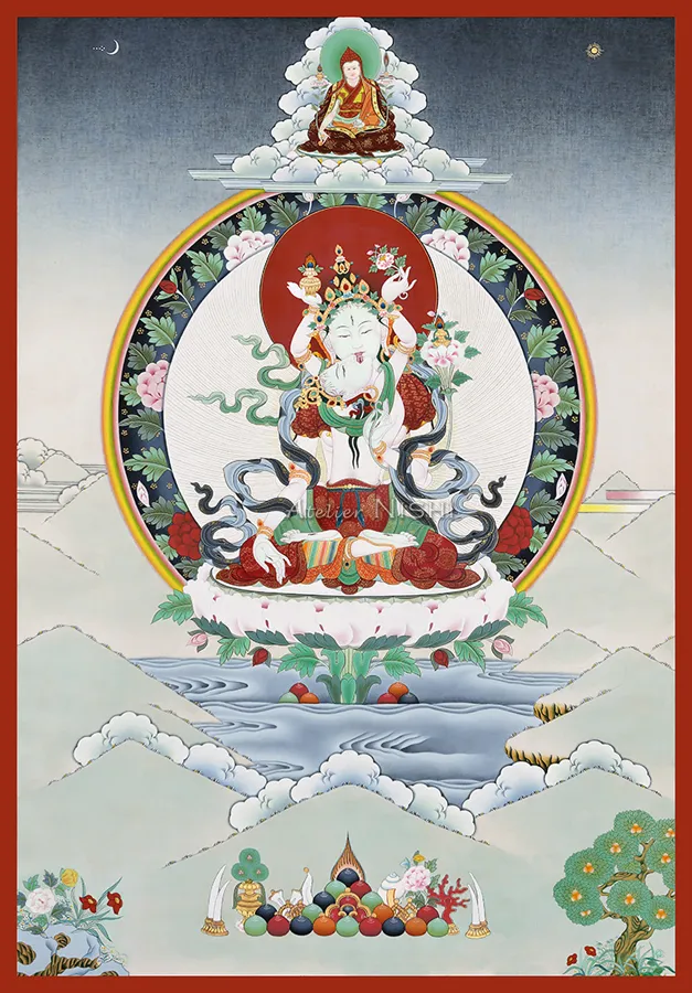 この作品に描かれる尊格は、シッキム出身のタンカ絵師ラデー・タギェル師の作品を模写したものです。ラデー・タギェル師は、ネパールのシェチェン寺にあるツェリン・アート・スクールの校長を務め、チベット仏教美術に大きな功績を残したクンチョク・ラデーパ師を導いた師でもありました。