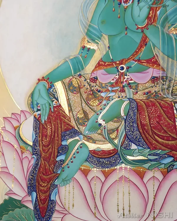 この作品は、ヒマラヤ文化圏で広く崇敬されている女性尊格、グリーンターラーを、日本の仏画が持つ繊細な様式を取り入れて制作したタンカです。磨いた純金が輝く黄金の装身具と、精緻な模様で飾られた衣を纏い端然と蓮華座に座す仏母ターラーは、穏やかで慈愛に満ちたまなざしを湛え、衆生に救済と帰依の拠り所を与えます。