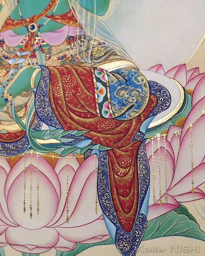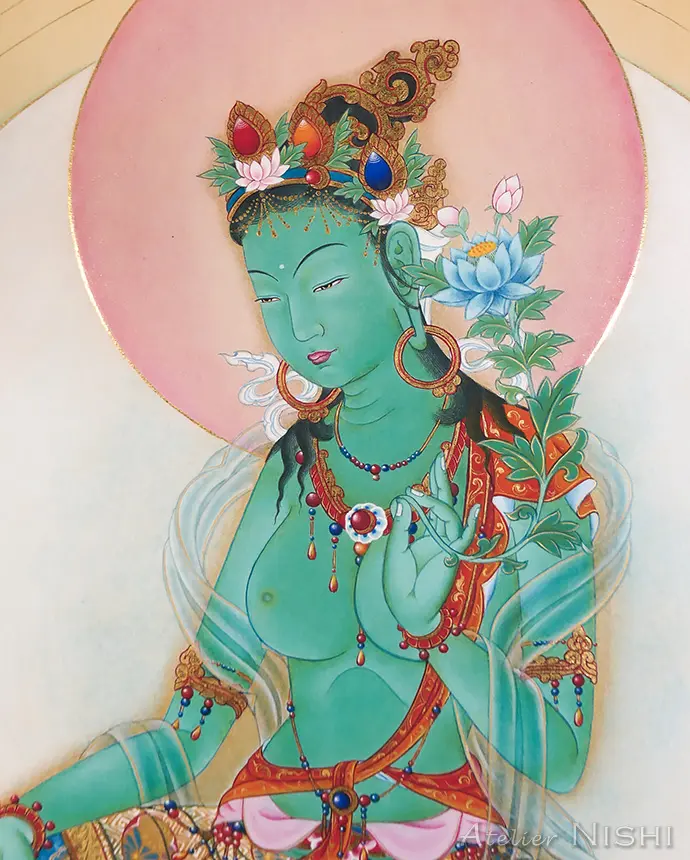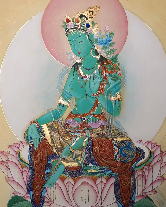 この作品は、ヒマラヤ文化圏で広く崇敬されている女性尊格、グリーンターラーを、日本の仏画が持つ繊細な様式を取り入れて制作したタンカです。磨いた純金が輝く黄金の装身具と、精緻な模様で飾られた衣を纏い端然と蓮華座に座す仏母ターラーは、穏やかで慈愛に満ちたまなざしを湛え、衆生に救済と帰依の拠り所を与えます。