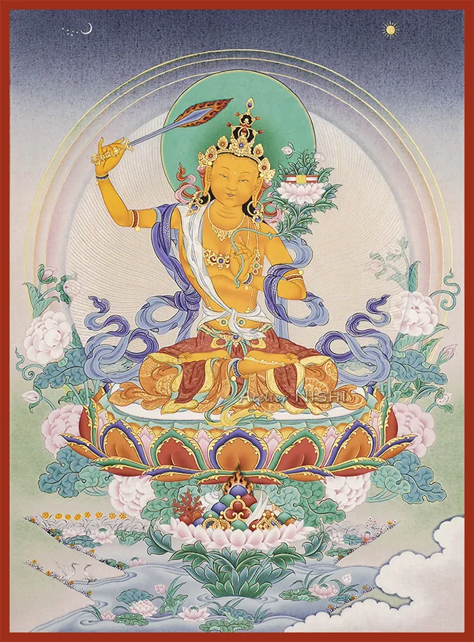 A4サイズのキャンバスに描かれたこのタンカは、智慧の尊格である文殊師利菩薩を描いています。