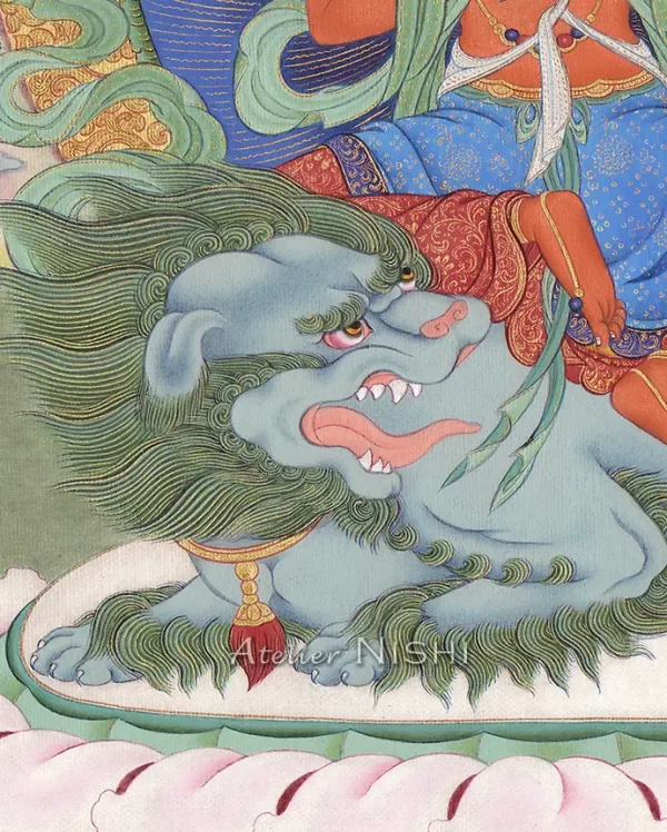A4サイズのキャンバスに描かれたこのタンカの小作品は、青い獅子に乗る智慧の尊格ジャムヤン・マウェ・センゲの姿を描いています。