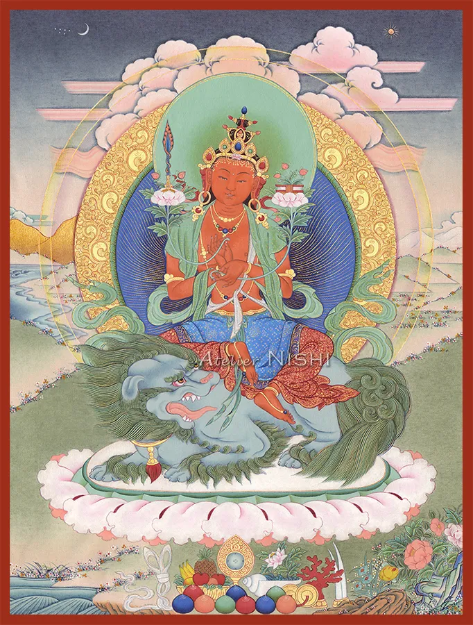 青い獅子の上に優雅に座し、静かな湖面のごとく澄みわたるその姿は、若々しく清らかな相貌を湛え、獅子の咆哮をもって迷いを打ち砕く。