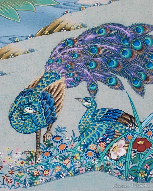 また、画面左下には長寿を象徴する一対の鶴が、右下には毒を克服し浄化する神秘的な力を持つとされる孔雀が二羽描かれ、尊格の功徳を象徴しています。