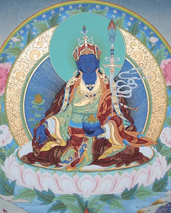 この作品には、薬師如来と同じ深い青色に輝く身体を持ち、穏やかな微笑みを湛えるグル・リンポチェが、虹の光に囲まれ優雅に蓮華座に座す姿が描かれています。
