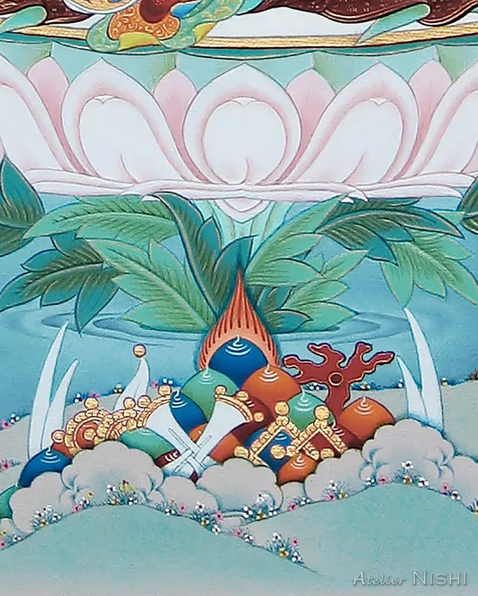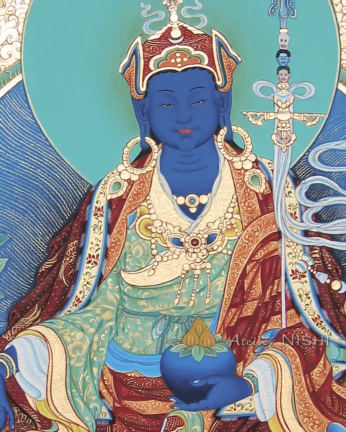 この作品には、薬師如来と同じ深い青色に輝く身体を持ち、穏やかな微笑みを湛えるグル・リンポチェが、虹の光に囲まれ優雅に蓮華座に座す姿が描かれています。