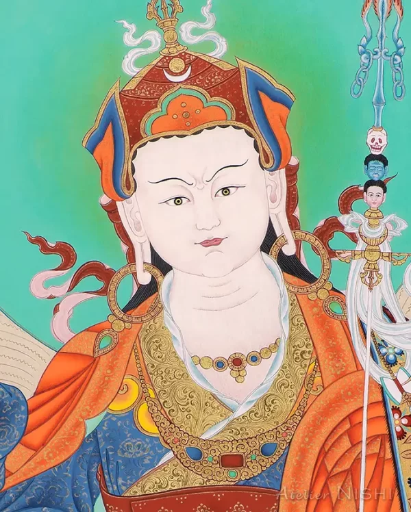 この作品は、雪をいただくヒマラヤの静謐な山並みが遥かに望まれる、透明感ある背景にグル・パドマサンバヴァを描いたものです。