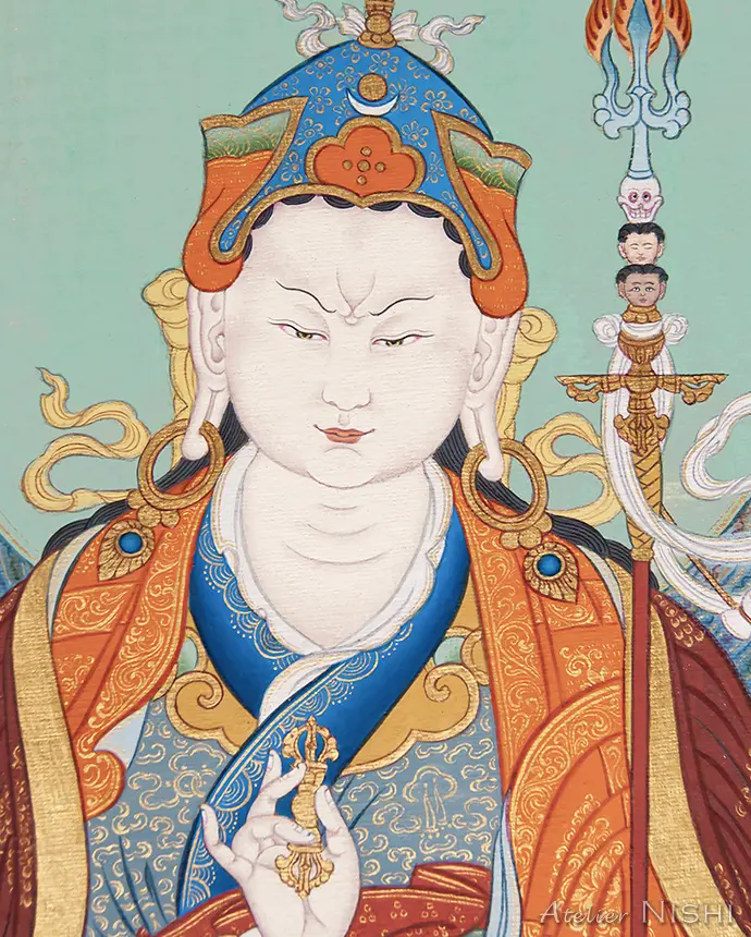 — このグル・リンポチェ像は、チベット人タンカ絵師による線画に基づいて制作されています —