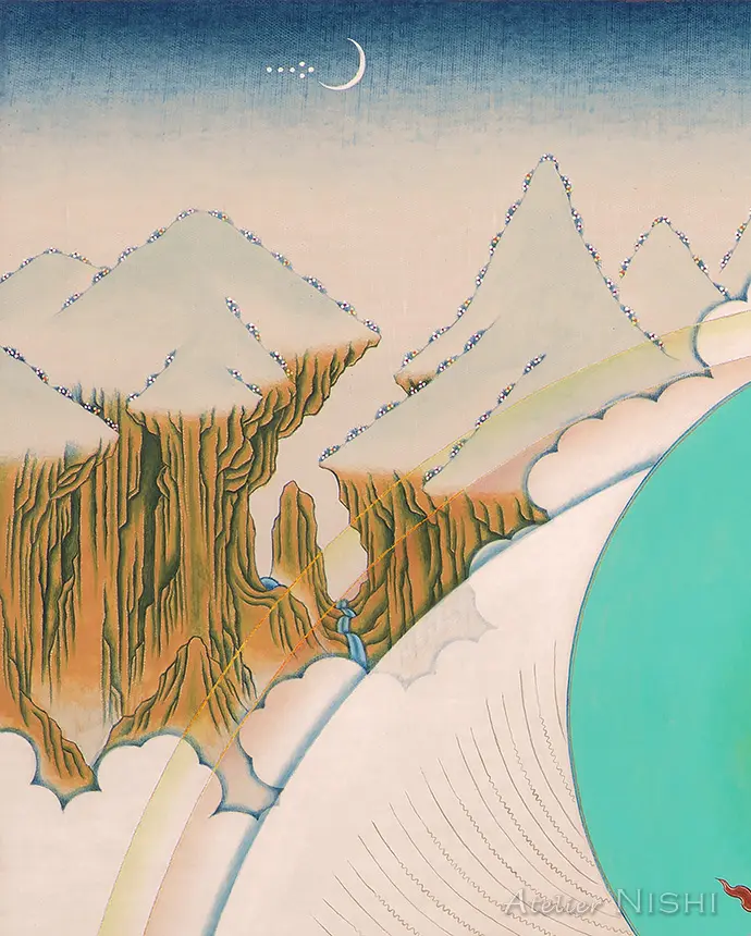 この作品は、雪をいただくヒマラヤの静謐な山並みが遥かに望まれる、透明感ある背景にグル・パドマサンバヴァを描いたものです。