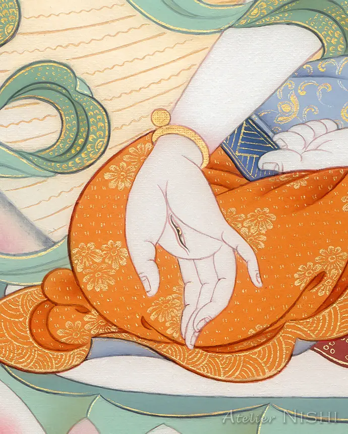 差し伸べられた柔らかな御手は、病を祓い、非時の死を超え、永遠の生命と霊明の甘露を授ける。幾千の満月のごとく輝く静謐で優雅なその姿は、遍き慈悲の光をもって心身を癒し、安らぎで満たす。
