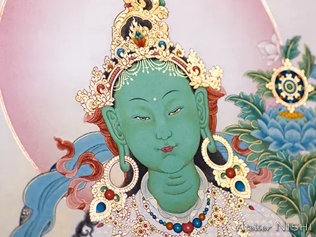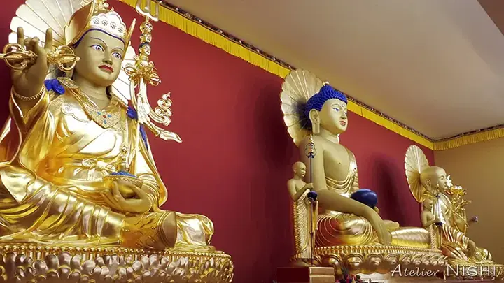 Adorned with golden dragons and Dharma Wheel using the traditional Tibetan relief technique