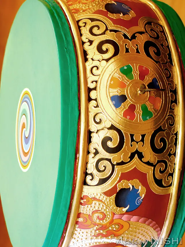 A traditional Tibetan relief painting technique known as “Kyum-bur” is used for most of the outlining and intricate details. The stretched leather surface is painted green, featuring a “Wheel of Joy”—or “Ga-kyil” in Tibetan—at its center.