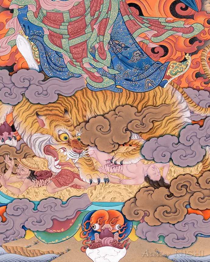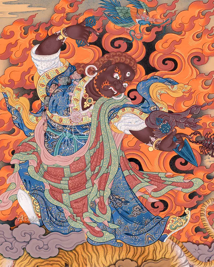 Amidst blazing wisdom flames, he dances upon a pregnant tigress, holding a vajra and a phurba in his hands—embodying enlightened wrath and subdues obstacles with boundless compassion.