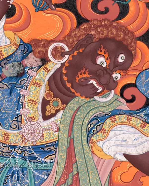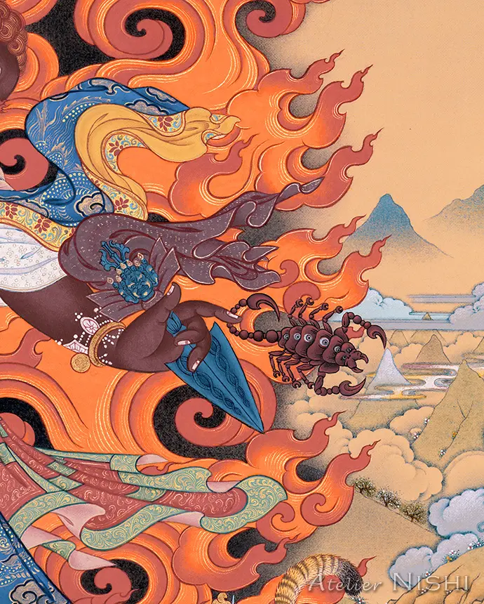 In his raised right hand, he holds a vajra (Dorje); in his left, a ritual dagger known as a phurba, adorned with a vajra and three wrathful faces. The sharp blade thrusts forward, as if to pierce the hearts of his foes.