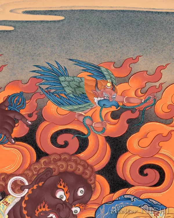 The canvas of this thangka was prepared using traditional materials, including yellow ocher, to achieve a deeper, yelowish-toned surface. This unique base lends greater depth and vibrancy to the colors, amplifying the sacred and wrathful presence of the depicted deity.