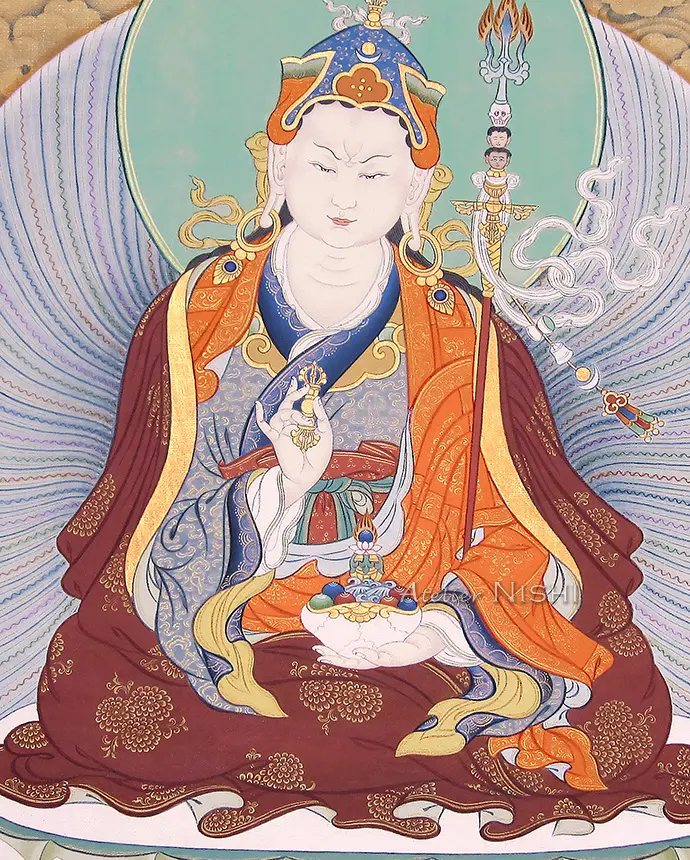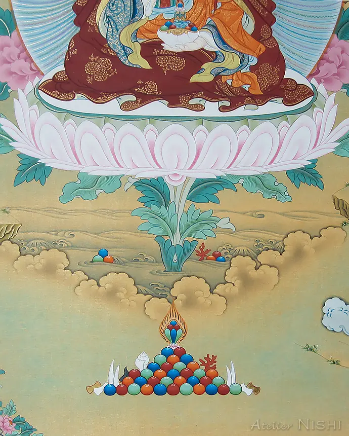 – The central figure of Guru Rinpoche is based on a line drawing by a Tibetan thangka artist –