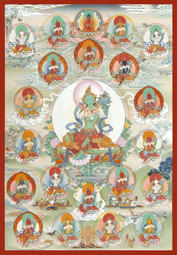 Manifesting in twenty-one distinct forms, the Twenty-One Taras embody her infinite loving-kindness — each one radiant with colors, gestures, expressions, and sacred symbols. From peaceful to fierce, serene to wrathful, she moves with swift and fearless grace, dissolving obstacles, dispelling fear, offering protection, and guiding all who call upon her.