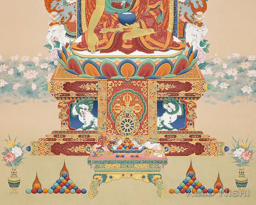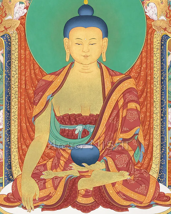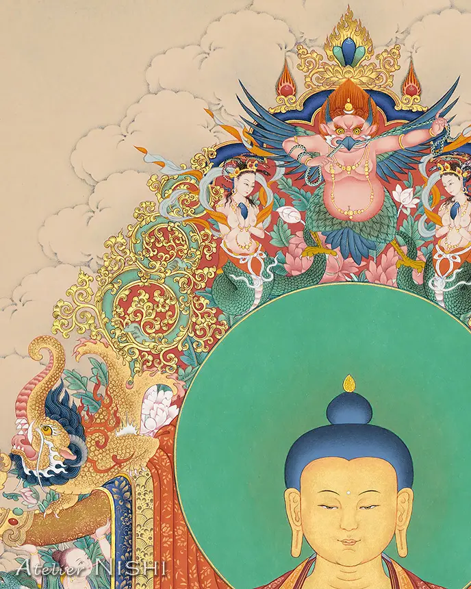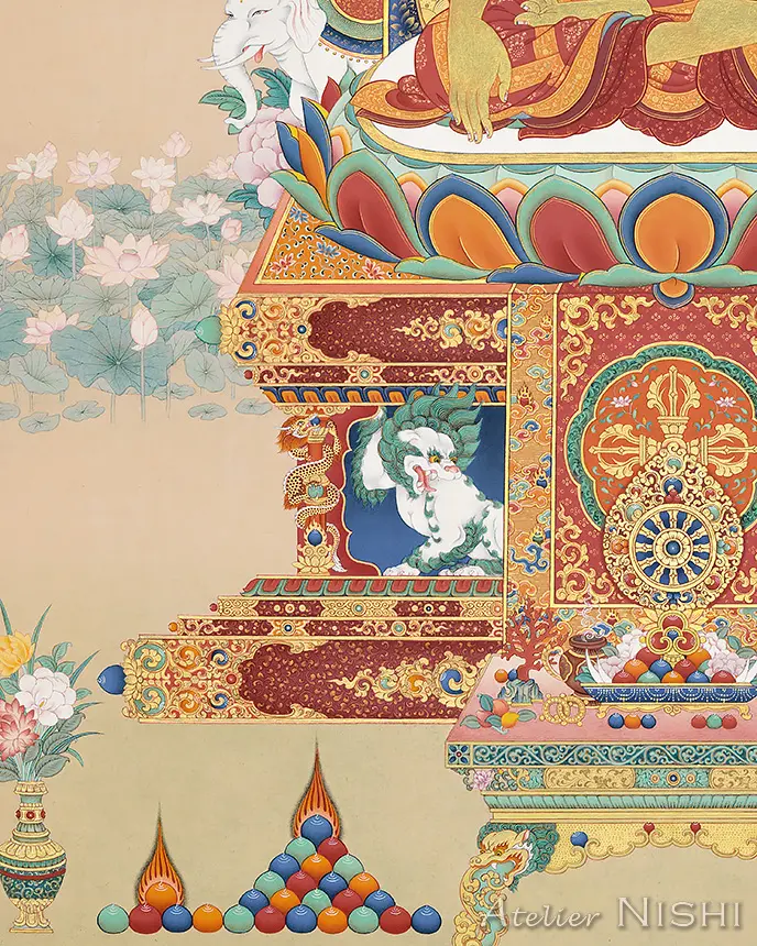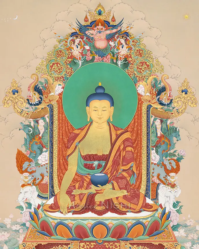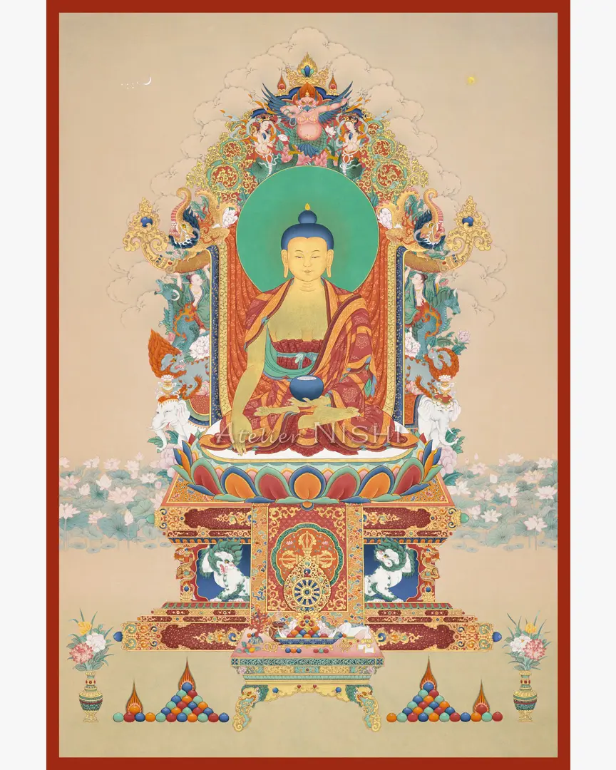 High-quality reproduction features a thangka of Buddha Shakyamuni, the founder of Buddhism, seated in the vajra posture upon a richly adorned throne and surrounded by auspicious mythological animals, faithfully reproducing the original’s rich colors and intricate detail.