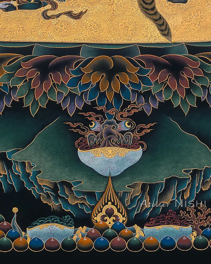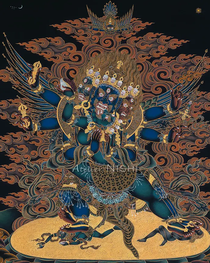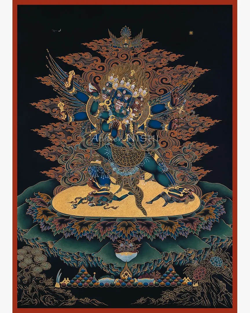 This high-quality reproduction features a thangka of Vajrakilaya, the wrathful deity who embodies the enlightened activity of all Buddhas. It has been faithfully recreated from an original painting executed in the traditional Nag-thang—or Black Thangka—style, using natural mineral pigments on silk.