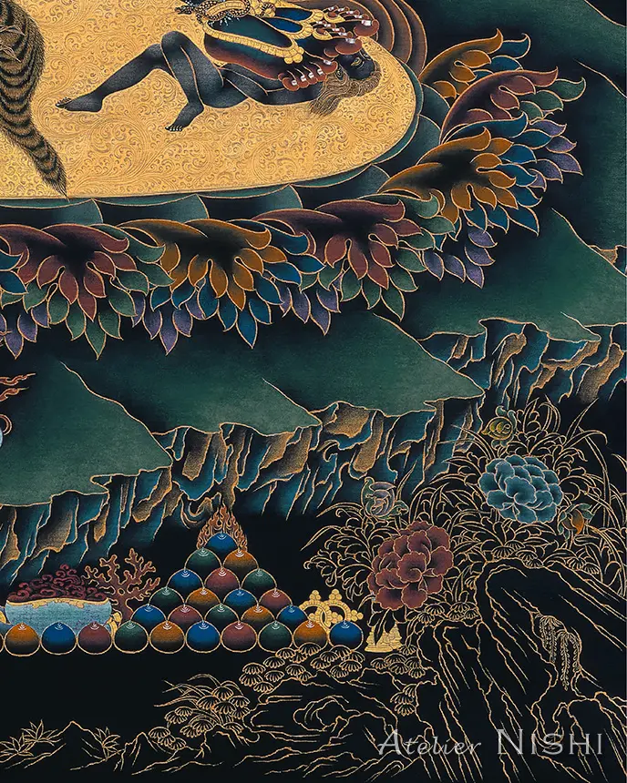 Vajrakilaya is shown in union with his female consort, manifesting in a powerful wrathful form with three faces, six arms, and four legs. His body is adorned with intricately rendered gold and bone ornaments, flowing silk sashes, and several finely detailed animal skins.