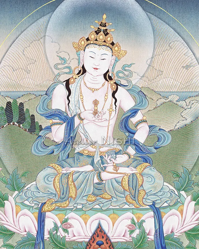 His luminous presence—often compared to a crystal or to snow-covered mountains gleaming under sunlight—is rendered with clarity in this painting. In keeping with these metaphors, the artwork intentionally minimizes the warm hues commonly found in traditional thangkas, resulting in a cool, radiant palette that enhances Vajrasattva’s pure and serene essence.