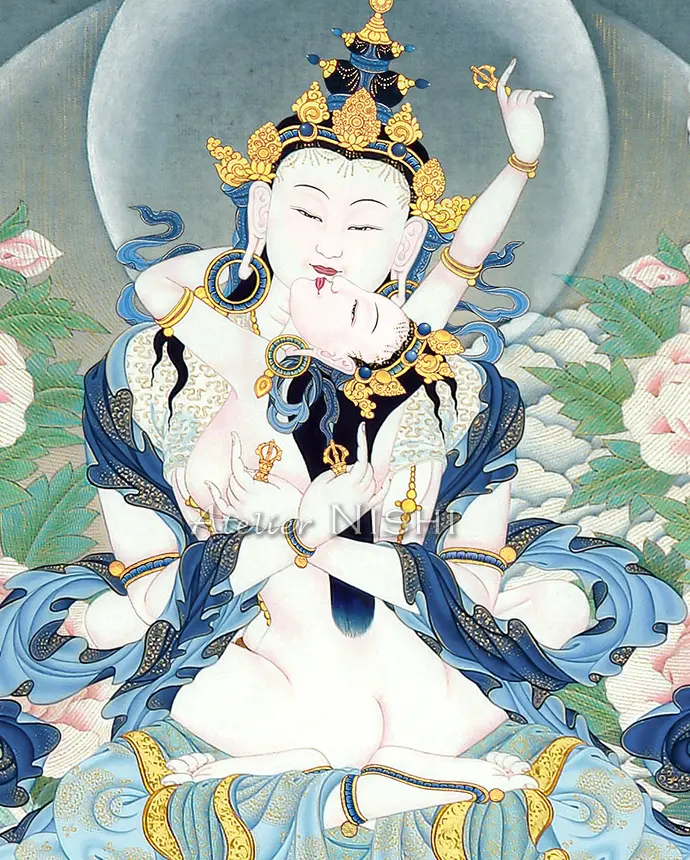 This high-quality reproduction features a thangka of Vajrasattva, the deity of purification, depicted in the Yab-Yum form, which symbolizes the profound union of wisdom and method. Unlike the usual depictions of Vajrasattva, this thangka shows him with an uncommon gesture, crossing both arms at his chest.