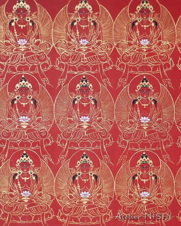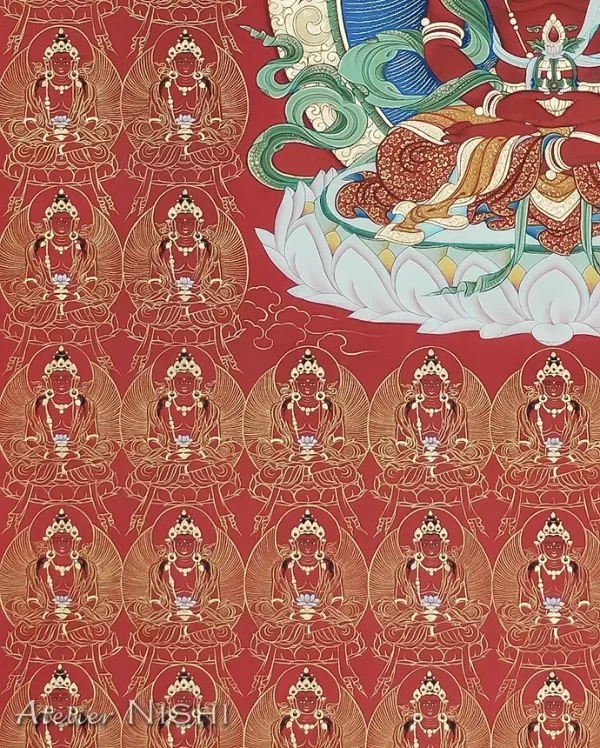 This thangka of Amitāyus is rendered in the traditional Tibetan style known as mar thang, where the entire canvas is painted in rich vermilion. The deity’s body is painted with cinnabar, and halo around him is rendered in radiant azurite blue, deep malachite green, and adorned with pure gold pigment. The gold-painted areas, such as the outer edge of the halo and the ornaments, have been carefully polished to produce a brilliant metallic sheen, creating a vivid contrast with the surrounding colors. Around Amitāyus are numerous smaller forms of himself, delicately drawn in fine gold lines. This compositional technique, not only enhances the deity’s blessings but also symbolizes the infinite manifestations and skillful means through which Amitāyus benefits sentient beings.