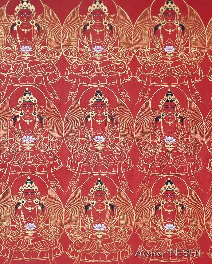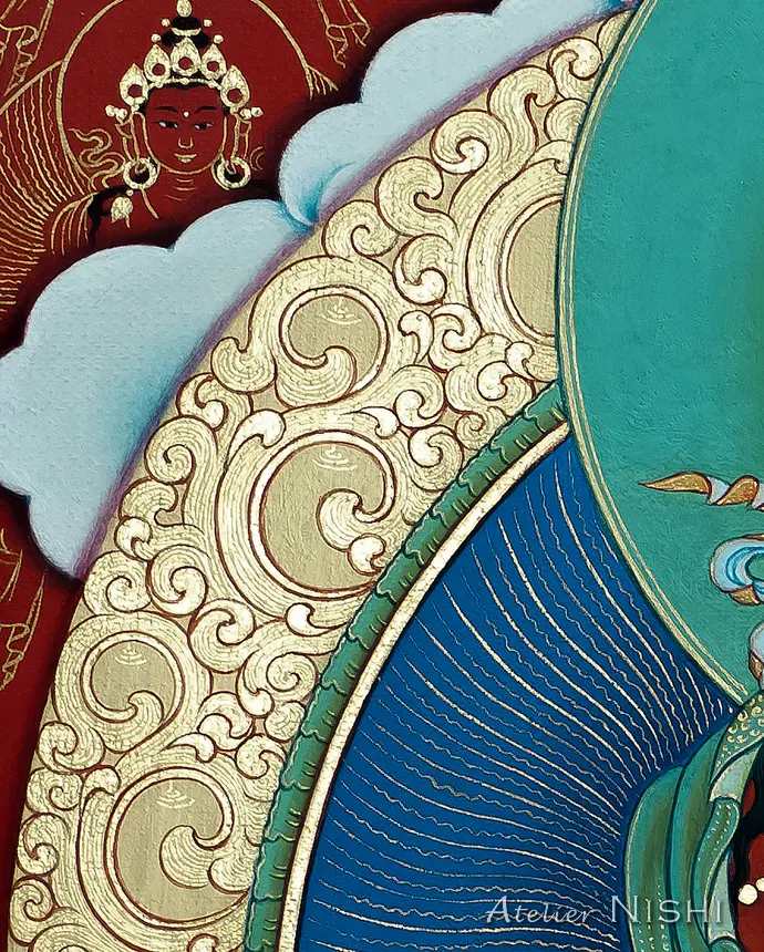 This thangka of Amitāyus is rendered in the traditional Tibetan style known as mar thang, where the entire canvas is painted in rich vermilion. The deity’s body is painted with cinnabar, and halo around him is rendered in radiant azurite blue, deep malachite green, and adorned with pure gold pigment. The gold-painted areas, such as the outer edge of the halo and the ornaments, have been carefully polished to produce a brilliant metallic sheen, creating a vivid contrast with the surrounding colors. Around Amitāyus are numerous smaller forms of himself, delicately drawn in fine gold lines. This compositional technique, not only enhances the deity’s blessings but also symbolizes the infinite manifestations and skillful means through which Amitāyus benefits sentient beings.