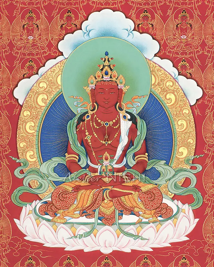 Dwelling in boundless light, he shines with the red glow of immortal vitality. Cradling the vase of Amrita, he bestows long life and the light of awakening.