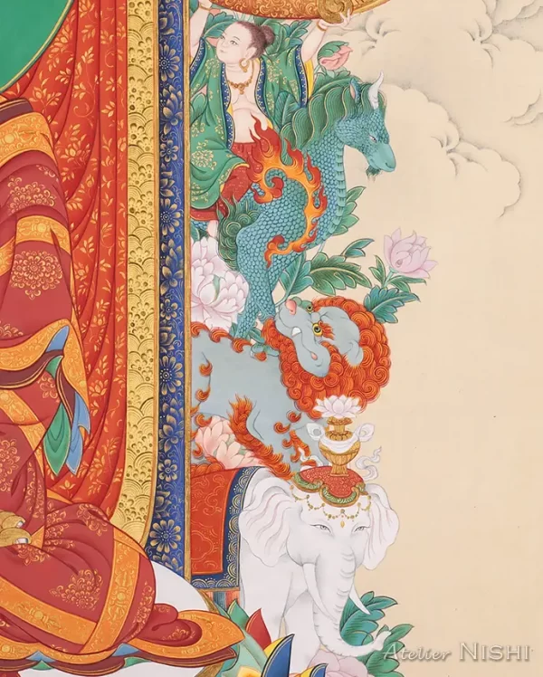 In this painting, Shakyamuni Buddha—the founder of Buddhism—is portrayed seated in the vajra posture upon a richly adorned throne. Unlike traditional thangkas, the background is rendered with elegant simplicity: the sky and earth are softly hued, free of clouds or mountains, while lotus flowers—some in full bloom, others still budding—rise softly behind the Lord Buddha, rendered in delicate pastel tones. In contrast to the serene background, the entire body of Buddha Shakyamuni is painted in gold, the sacred animals, the offerings, and the ornate throne are rendered with attentive detail and enriched with refined application of pure gold, highlighting the moment of his awakening.