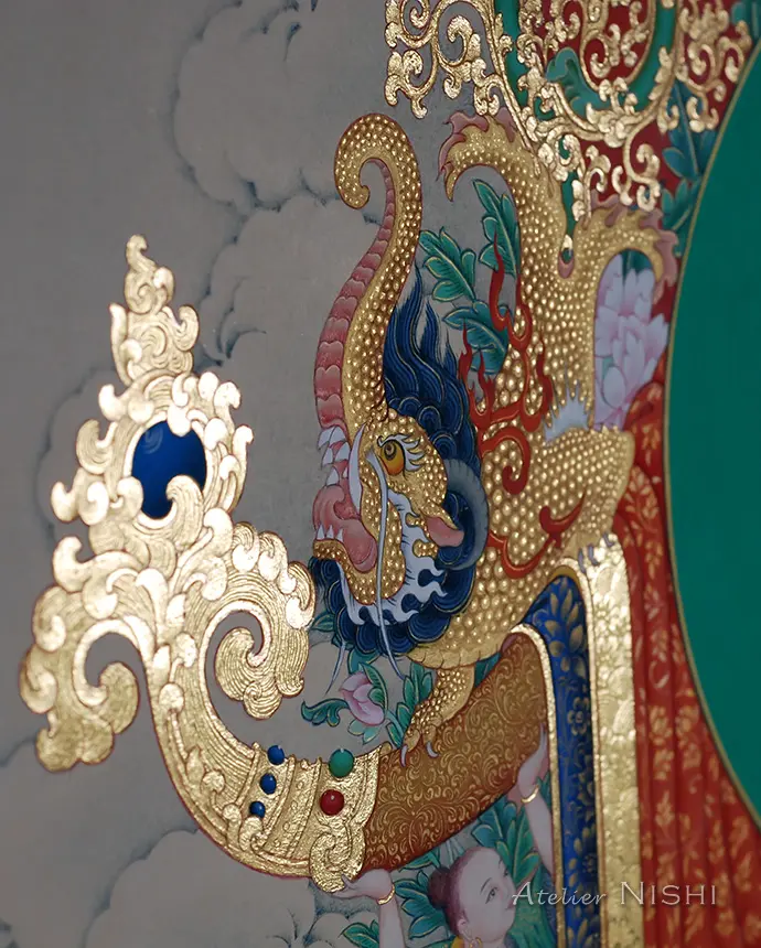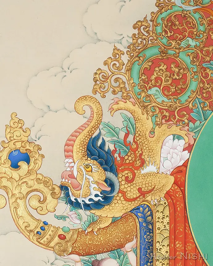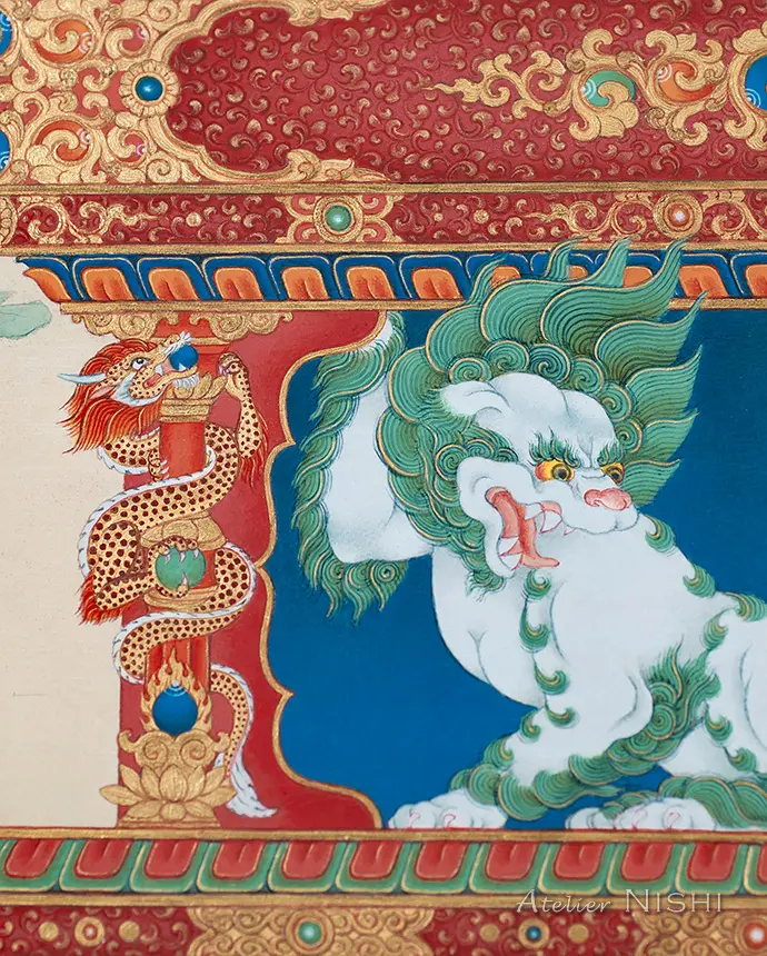 In this painting, Shakyamuni Buddha—the founder of Buddhism—is portrayed seated in the vajra posture upon a richly adorned throne. Unlike traditional thangkas, the background is rendered with elegant simplicity: the sky and earth are softly hued, free of clouds or mountains, while lotus flowers—some in full bloom, others still budding—rise softly behind the Lord Buddha, rendered in delicate pastel tones. In contrast to the serene background, the entire body of Buddha Shakyamuni is painted in gold, the sacred animals, the offerings, and the ornate throne are rendered with attentive detail and enriched with refined application of pure gold, highlighting the moment of his awakening.