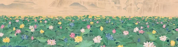 This interplay between the ethereal lightness above and the calm radiance of the richly pigmented lotus flowers and leaves below adds depth and dimensionality to the entire composition.