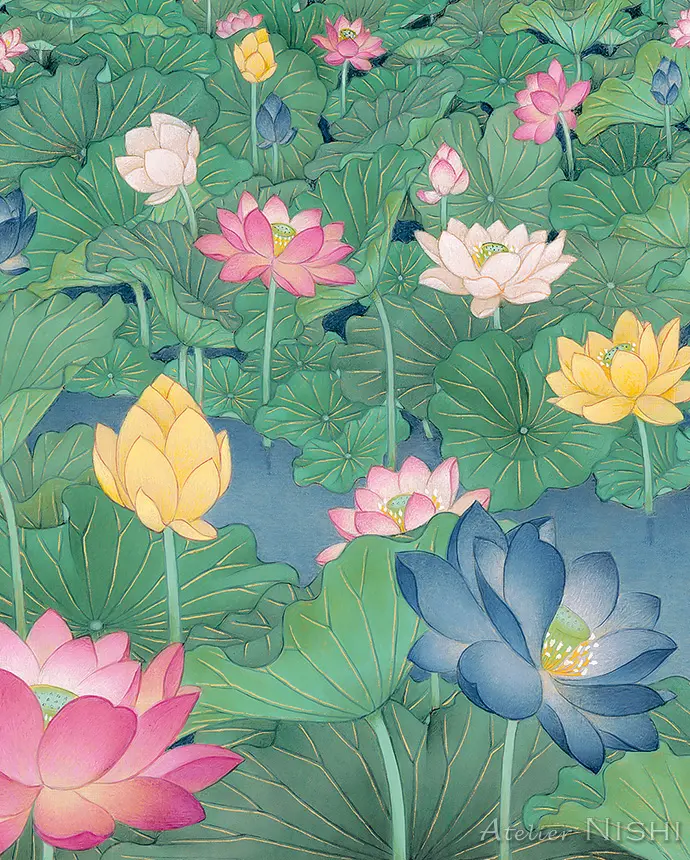This interplay between the ethereal lightness above and the calm radiance of the richly pigmented lotus flowers and leaves below adds depth and dimensionality to the entire composition.