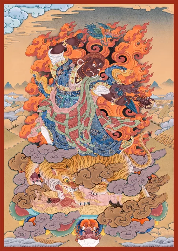 Amidst blazing wisdom flames, he dances upon a pregnant tigress, holding a vajra and a phurba in his hands—embodying enlightened wrath and subdues obstacles with boundless compassion.