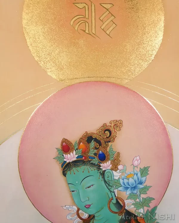 This thangka portrays Green Tara, a revered female deity widely venerated in Tibetan Buddhism, rendered here with the subtle aesthetic sensibility of Japanese Buddhist painting.