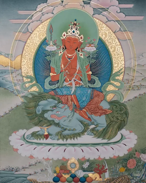 He sits gracefully atop a majestic blue lion, forming a sacred mudra at his heart.