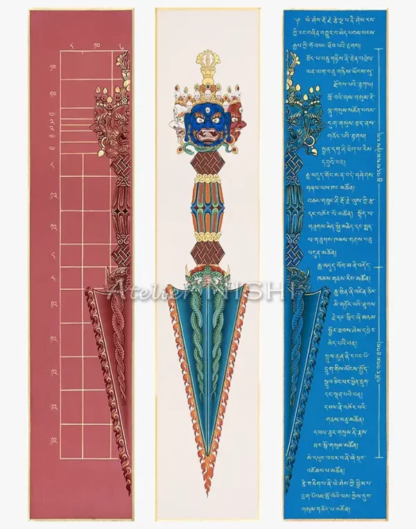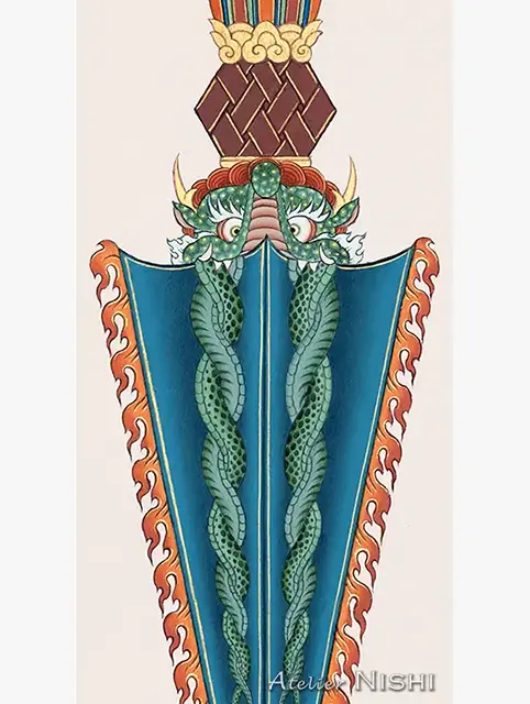 - A fully colored Phurba, meticulously depicted against a white background —emphasizes the ritual dagger’s intricate form and vibrant detail.