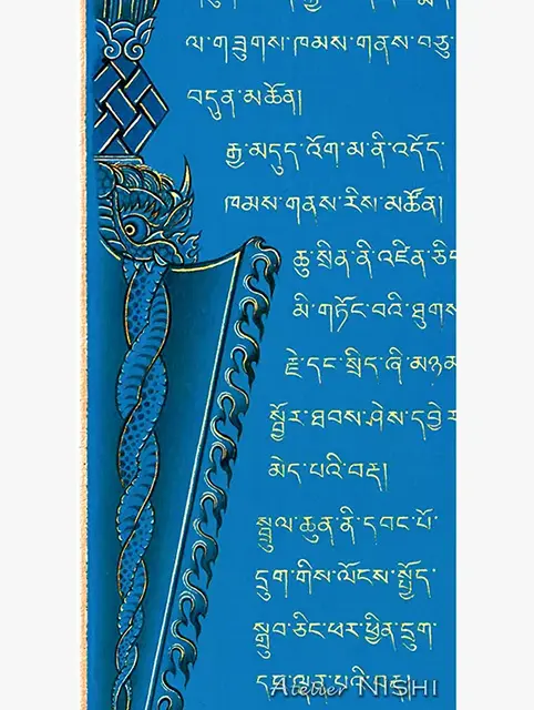 - A golden line drawing on an azurite blue background—featuring Tibetan script—conveys the symbolic essence of the Phurba.