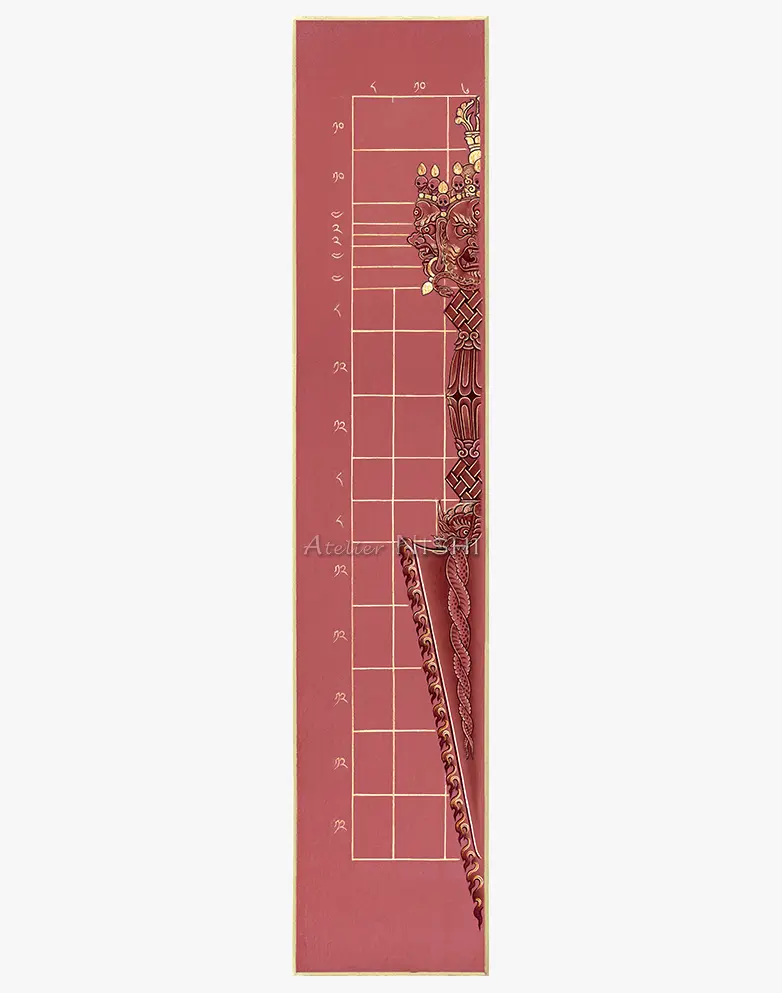 - A golden line drawing on a vermilion red ground—accompanied by a measuring scale and illustrating the traditional proportions of the Phurba.