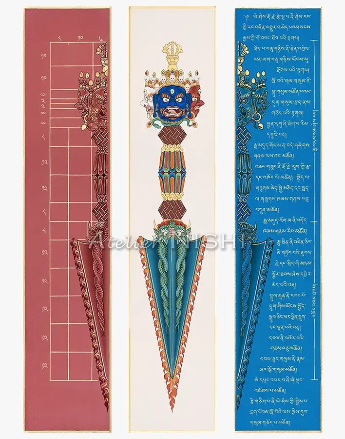 This triptych presents the Tibetan ritual dagger, Phurba, from three distinct aspects, each rendered on a Japanese tanzaku board (7.5 × 36.2 cm), exploring its symbolic depth through color, form, and symbolism.