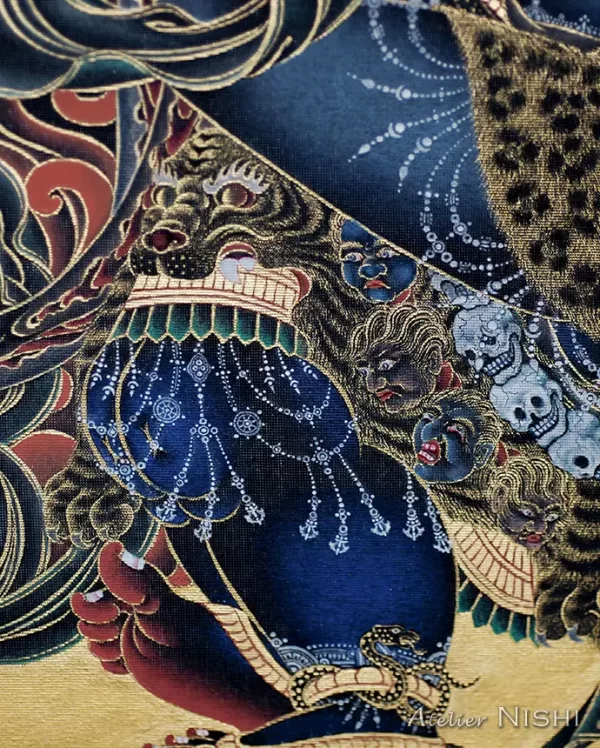 Unlike standard Himalayan thangka paintings executed on cotton canvas, this piece is painted on silk—a material traditionally used in classical Japanese painting.