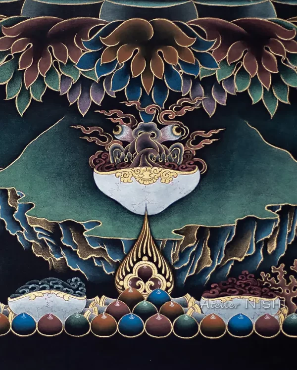 This thangka portrays Vajrakilaya, rendered in the traditional “Nag-thang style”, in which the entire surface is painted black and illuminated with exquisite lines of pure gold. Soft gradations of natural pigments further enhance the composition, infusing it with depth and an aura of mystical luminosity.