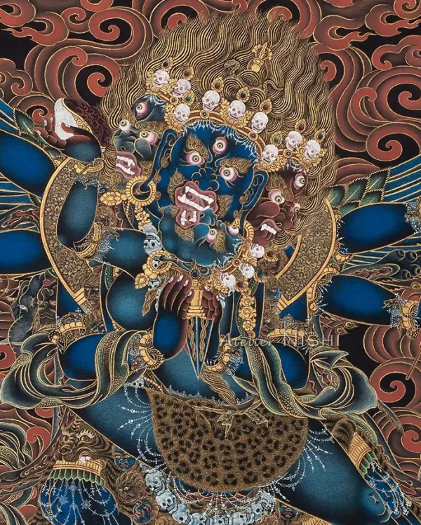 Bearing three faces that cleave through the three root poisons, he holds the wisdom dagger that strikes through ignorance. Aflame with fierce power and crowned with wings, the great Heruka manifests as the remover of obstacles, the destroyer of both inner and outer demons.