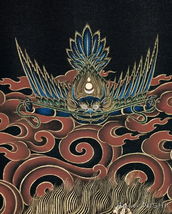 Surrounded by a radiant blaze of wisdom fire, he obliterates the forces that obscure the path to awakening. His wrathful countenance reveals the piercing clarity of awakened mind, dissolving ego and fear.