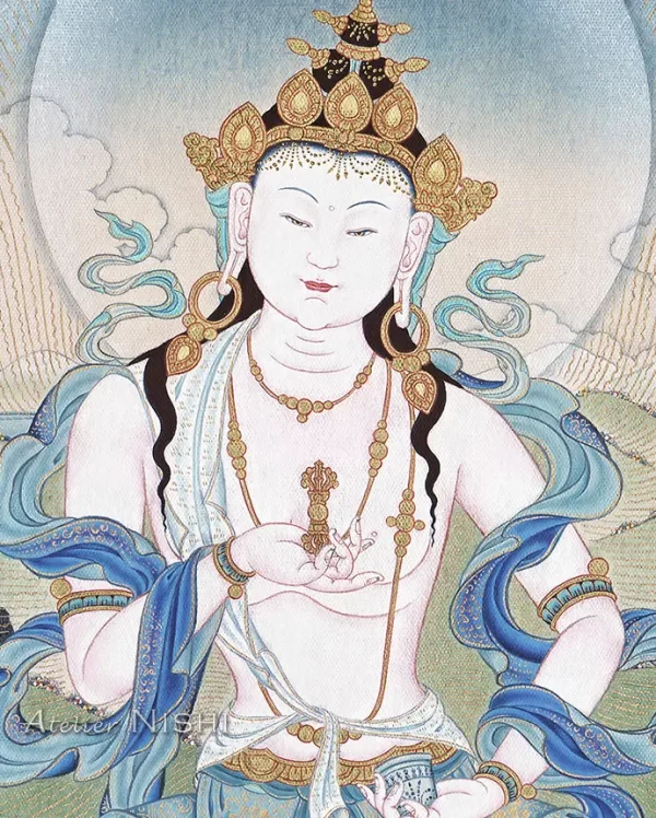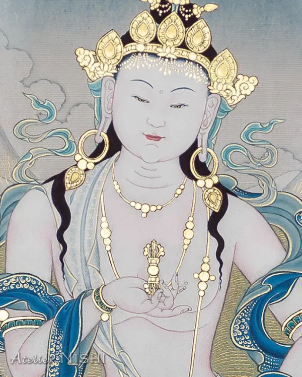 His luminous presence, often likened to “a crystal” or “snow-covered mountains gleaming under sunlight”. In accordance with these metaphors, warm hues commonly seen in traditional thangkas are intentionally omitted. The composition is instead rendered with cool, translucent tones of blue and green, enhanced solely with pure gold pigment. Soft white halos surround Vajrasattva, with fine gold lines depicting radiant light, allowing the background to remain visible. Gold ornaments polished with agate add further radiance and elevate the refinement of the translucent blues and greens.