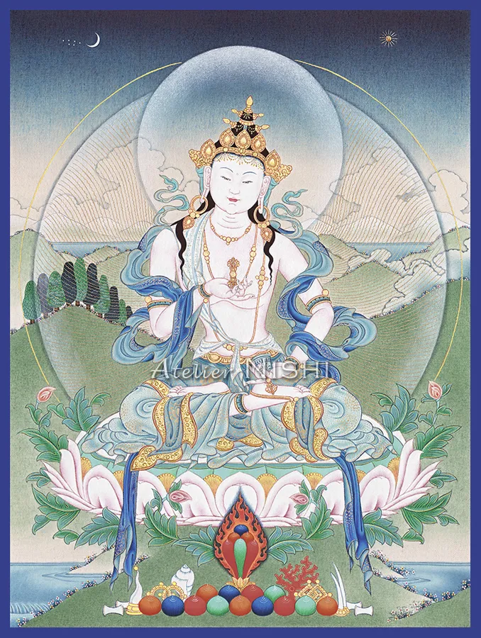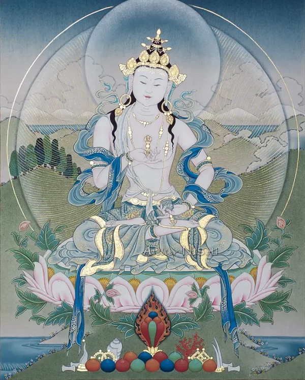Vajrasattva shines like a crystal peak on a sunlit snow mountain — calm, clear, and luminous.