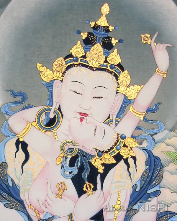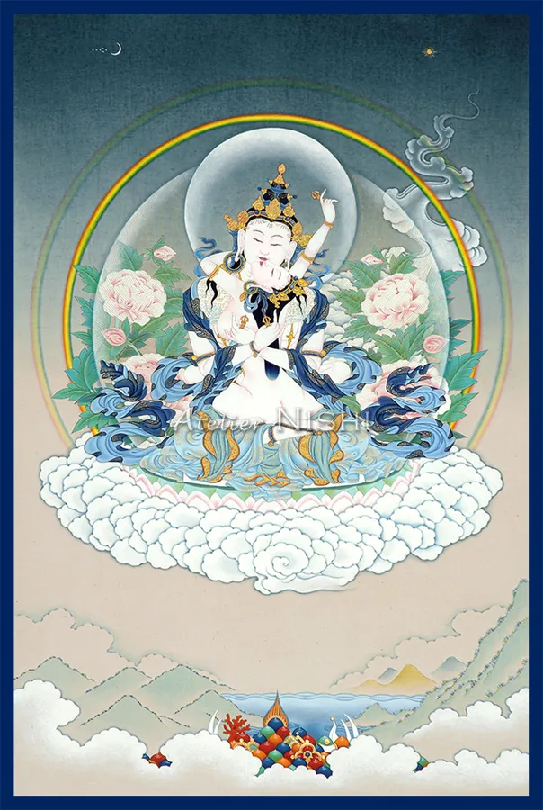 With a luminous white body, he appears in luminous union with his consort — a sacred form representing the inseparable union of method and wisdom.