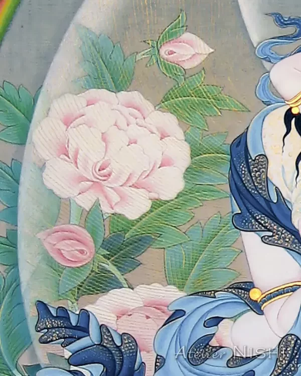 The radiance of Vajrasattva are sometimes likened to “snow mountains gleaming in sunlight” or to “crystal.” Reflecting this imagery, this thangka departs from the conventional palette, warm tones such as red or orange are entirely absent. The body of the deity is rendered in pure white, while nearly all other elements are painted in cool tones — various shades of azurite and malachite pigments — highlighted with pure gold.