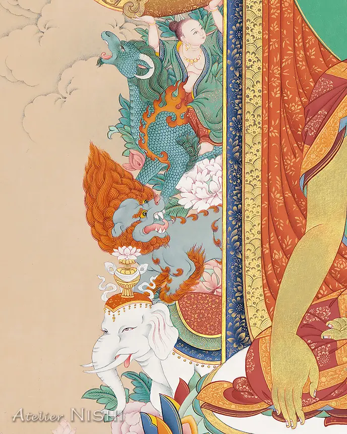 荘厳な獅子の宝座に金剛跏趺坐で坐す仏陀の前には、花々と共に様々な供物が供えられ、その後ろには、極淡く彩色された空と大地を背景に蓮華が広がっています。清浄で気高い覚者の周りには、精密に描かれた聖なる動物たちがアーチ状に並び、真理に到達した仏陀の姿をいっそう際立たせています。