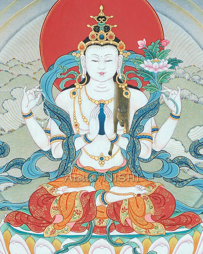 観音菩薩(チェンレジー)は無限の慈悲を象徴し、ヒマラヤ文化圏で最も尊崇される尊格のひとつです。本作品は、その観音菩薩を描いたタンカの高品質複製画です。