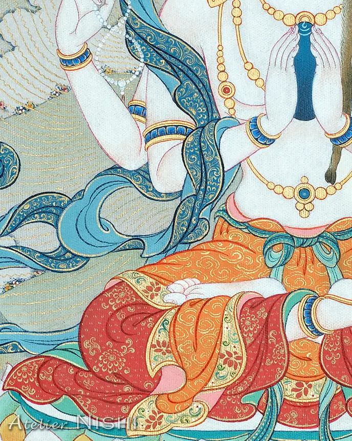 淡い彩色を施した背景を背に、幾重にも重なる透明な光輪に包まれて座す観音菩薩。その穢れのない白い尊容を描いたタンカの精緻な美しさを忠実に再現し、100%コットン製ファインアート紙にプリントされたアーカイブクオリティの作品です。
